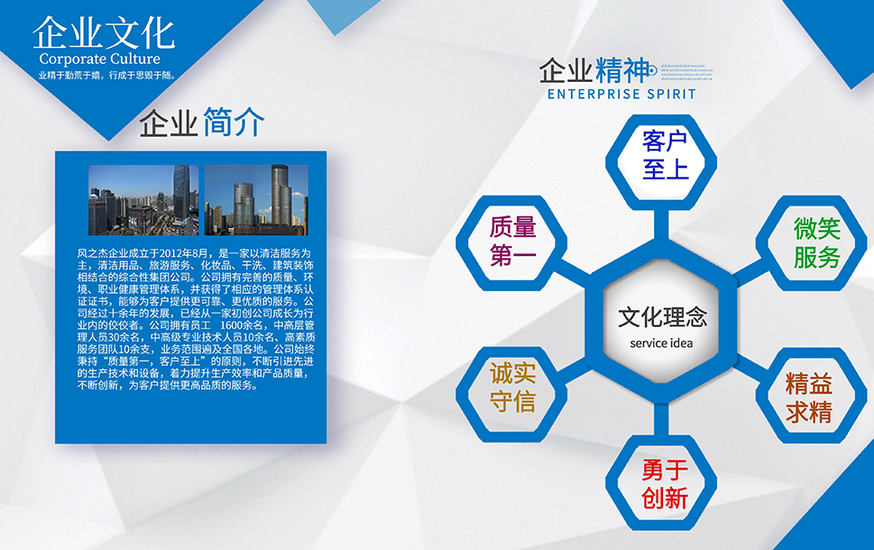 公司于2012年8月成立,致力于將9年的線下管理經(jīng)驗進行線上整合,復制推廣,力爭打造一個全國性的家庭服務平臺,并基于家庭服務的大數(shù)據(jù),融合人工智能,整合服務資源,為家庭提供全方位,多保障的管家式服務,目前風之杰已與全國百余家企業(yè)簽署戰(zhàn)略合作,通過全體員工堅持不懈的努力,逐步布局全國,完善服務,提高品質,一切努力,只為盡我所能,凈你所想。